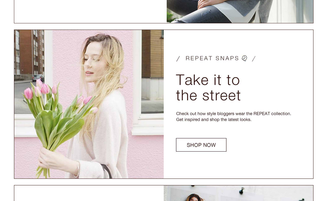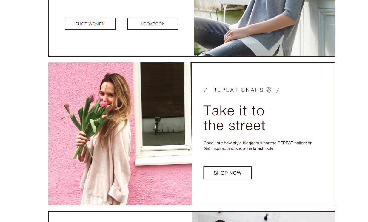 Ma petite (grosse) victoire de la semaine dernière, c’était et c’est toujours ici que cela se passe : www.repeatcashmere.com (je précise qu’il vous faut être sur votre ordinateur car cela ne fonctionne pas sur le mobile). Maman, Papa, j’espere que vous êtes fiers de moi. Je n’aurais jamais cru être un jour en page d’accueil d’un site de mode de luxe, juste en dessous de la mannequin célèbre Doutzen Kroes. La petite vidéo animée, où je porte mon gilet en cachemire et où je tiens mes fleurs préférées, des tulipes roses, tirée de ce look, est en ligne depuis jeudi sur le site de Repeat Cashmere et jusqu’à jeudi prochain, le 30 avril 2016.